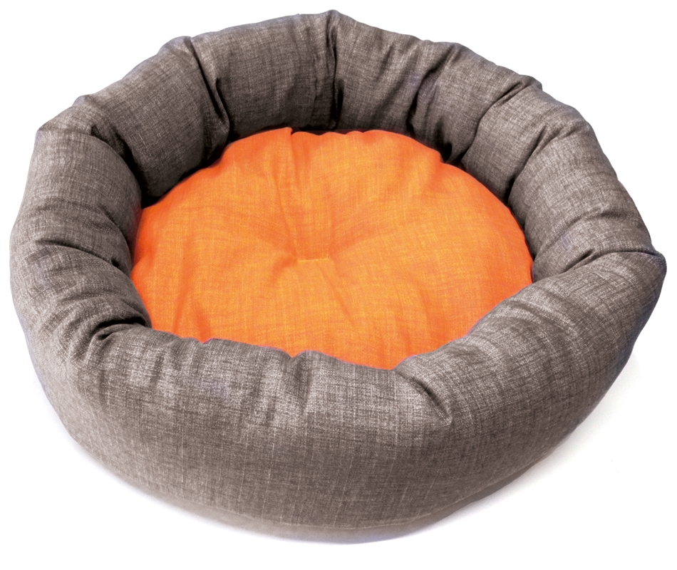 cuccia tonda per cani in tessuto arredo con cuscino double face arancio e grigio.
