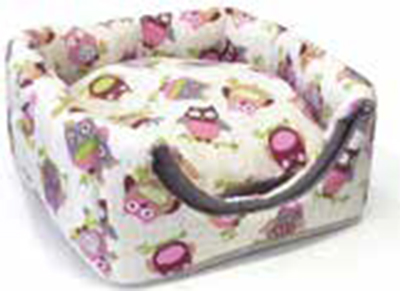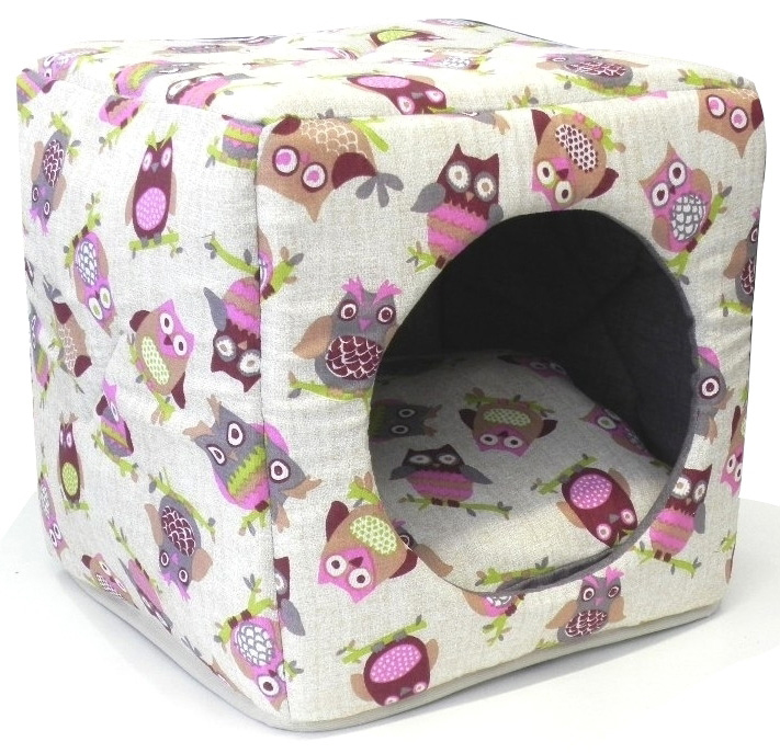 cubo imbottito trasformabile in cuccetta con fantasia gufetti e cuscino double face.