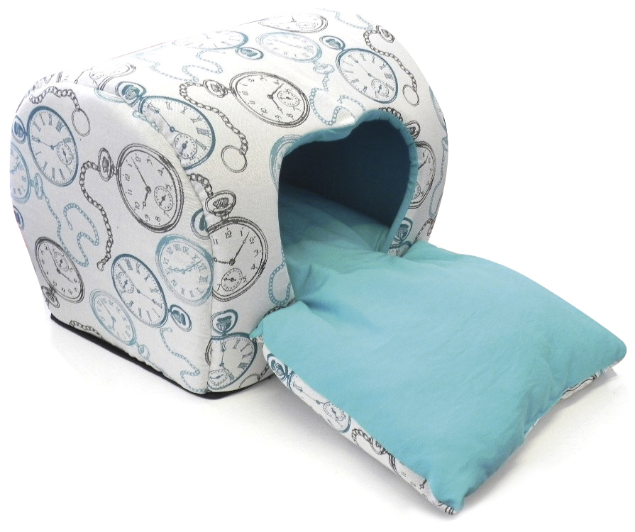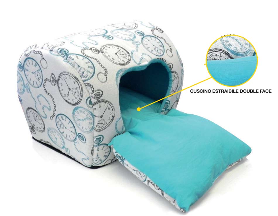 cuccia a casetta - tunnel con ingresso a forma di cuore con comodo cuscino estraibile double face. Caratterizzato da fantasia orologi, toni celeste, abbinato a tinta unita celeste .