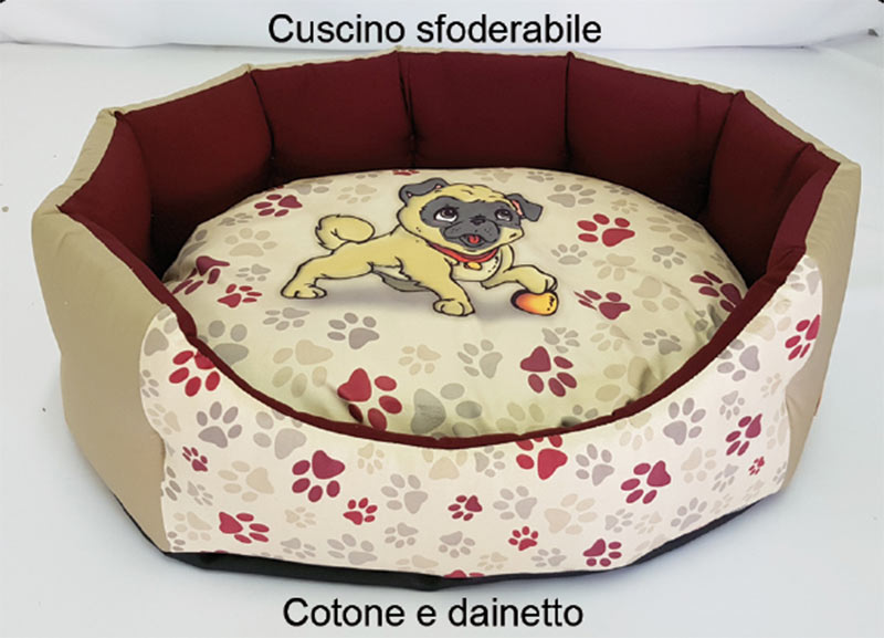 stampa del disegno della razza su motivo caratterizzato da orme di zampette, il confezionamento della struttura alterna le orme a tinta unita.