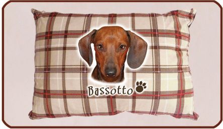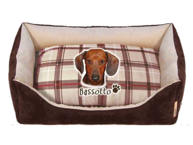 Composta da struttura a tinta unita e cuscino indipendente è interamente sfoderabile e lavabile in lavatrice. Le spalliere della struttura sono sagomate per facilitare il reinserimento, il fondo è in ecopelle, il cuscino è double face con un lato personalizzato per razza su motivo tartan e un lato in tinta unita come il bordo.