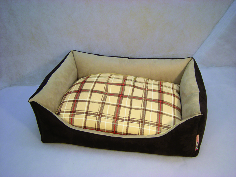 divanetto per cani interamente sfoderabile e lavabile, fantasia british e tinta unita.