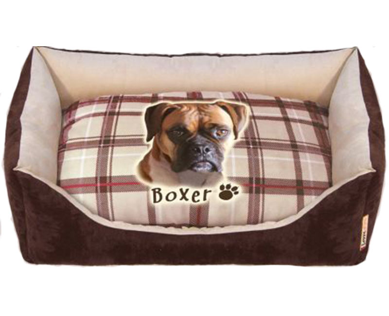 Le spalliere della struttura sono sagomate per facilitare il reinserimento, il fondo è in ecopelle, il cuscino è double face con un lato personalizzato per razza su motivo tartan e un lato in tinta unita come il bordo.