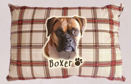 cuscino stampato (in sublimatico) con immagine della razza su motivo tartan- british - tessuto dainetto.