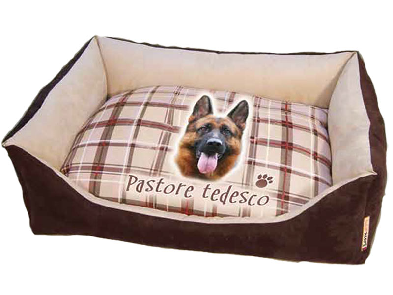 Le spalliere della struttura sono sagomate per facilitare il reinserimento, il fondo è in ecopelle, il cuscino è double face con un lato personalizzato per razza su motivo tartan e un lato in tinta unita come il bordo.