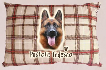 cuscino stampato (in sublimatico) con immagine della razza su motivo tartan- british - tessuto dainetto.