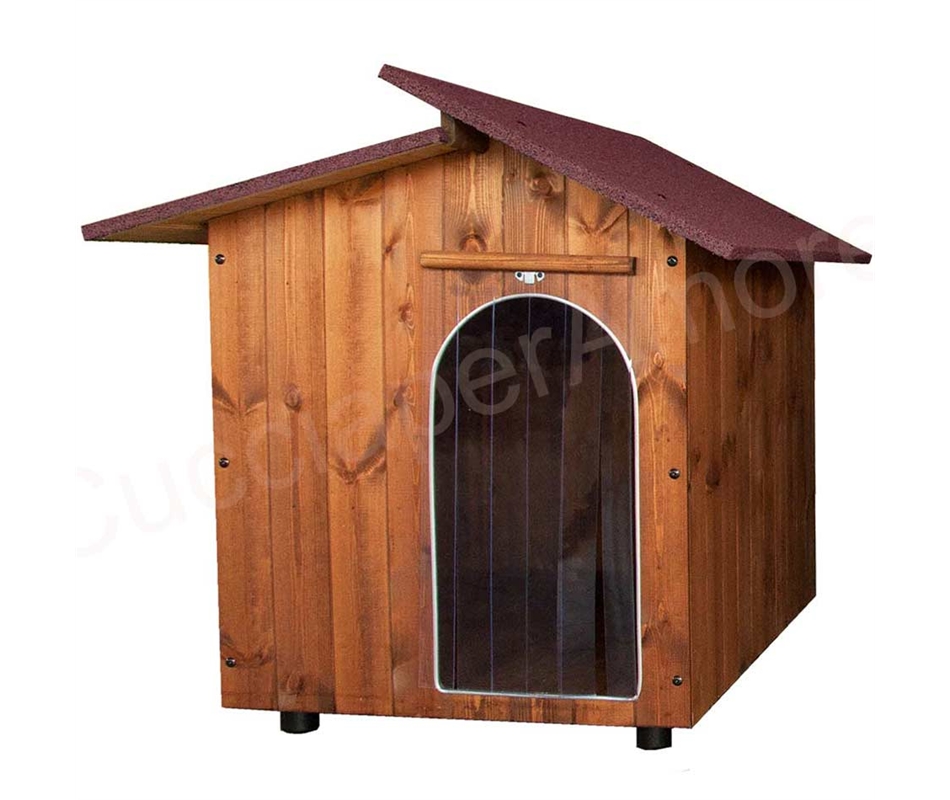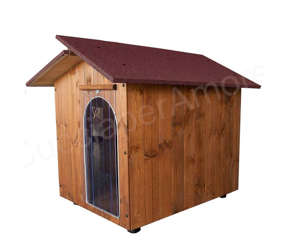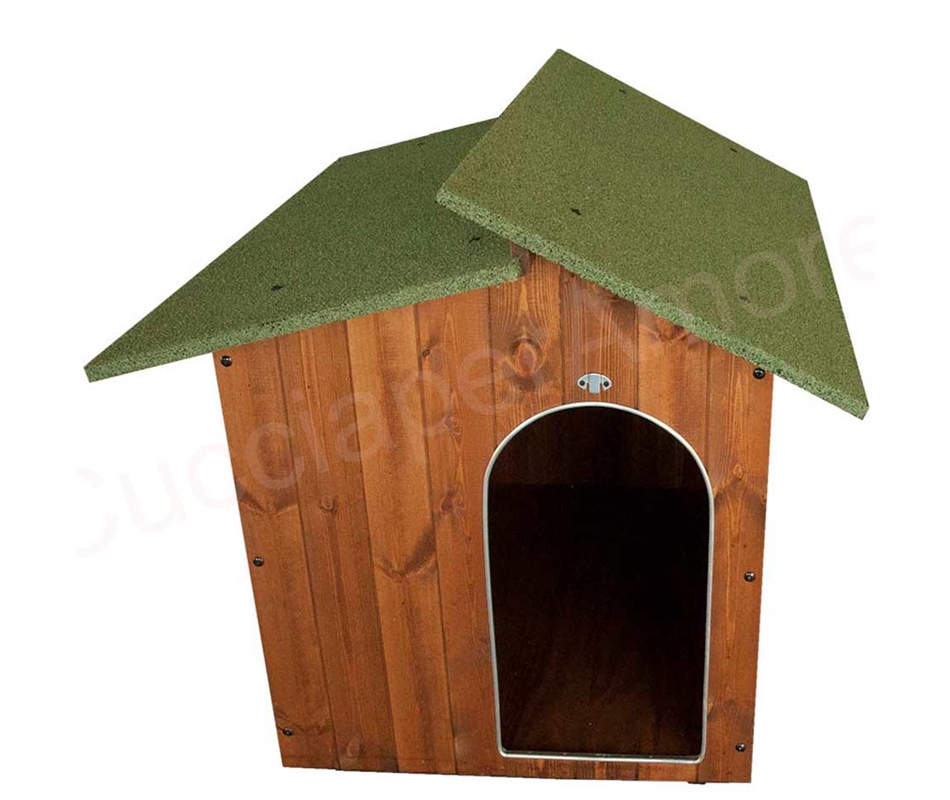 In legno, con tetto a falde sovrapposte, con piedi in gomma.