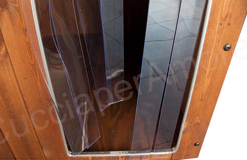 -tendina in pvc, trasparente, per limitare lo scambio d'aria con l'esterno di tipo cristal (molto luminosa e trasparente); con gancio per poterla rimuovere