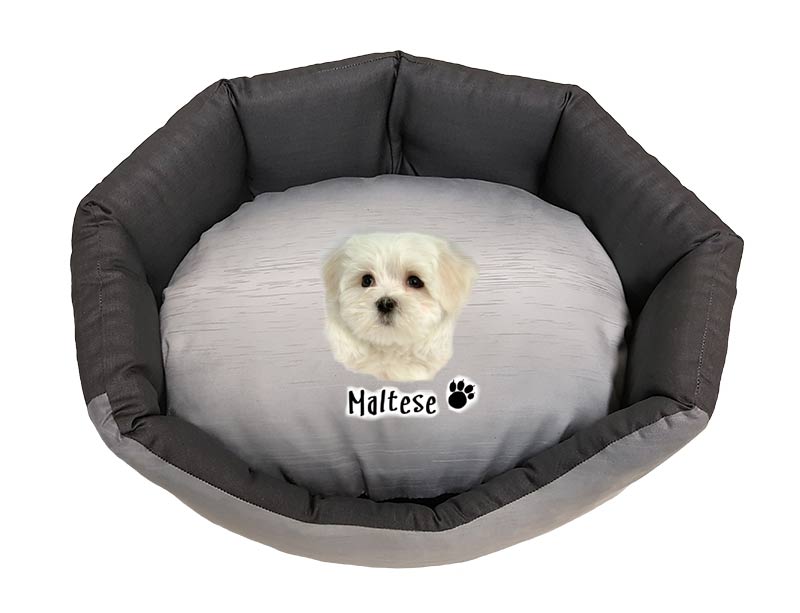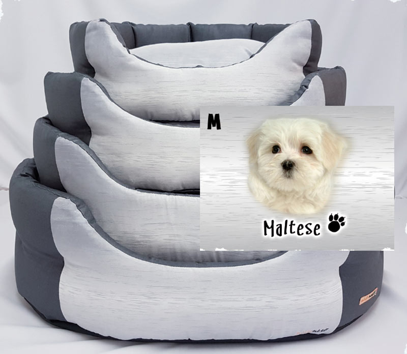 Su raffinate tonalità del grigio, questa cuccia ha forma di trono ovale (cesta), morbida nelle imbottiture, personalizzata con la stampa della razza.