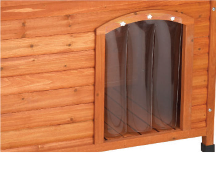 Opzionalmente la cuccia può essere dotata di una tendina in pvc trasparente per limitare lo scambio d'aria con l'esterno durante il periodo invernale.