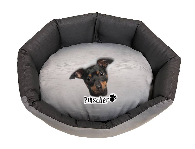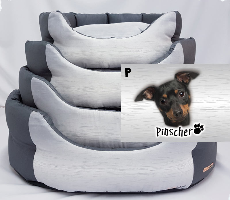 Su raffinate tonalità del grigio, questa cuccia ha forma di trono ovale (cesta), morbida nelle imbottiture, personalizzata con la stampa della razza.